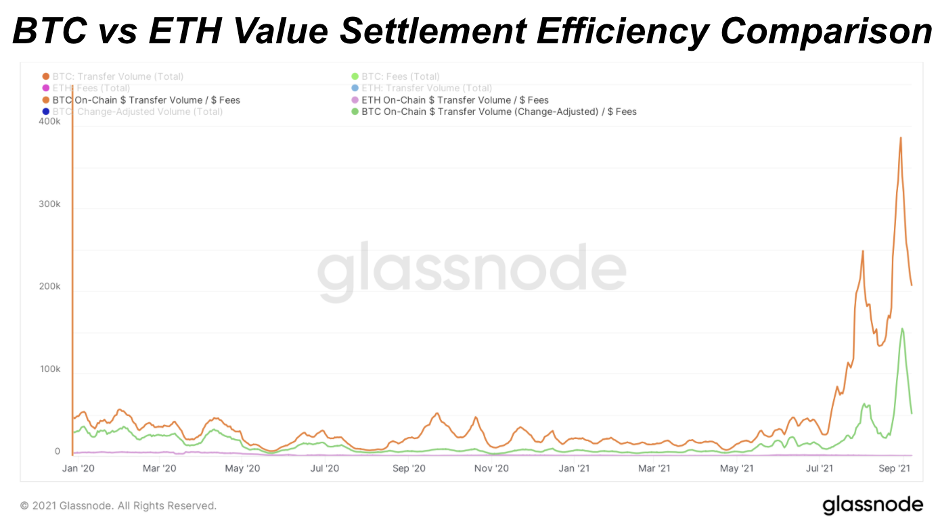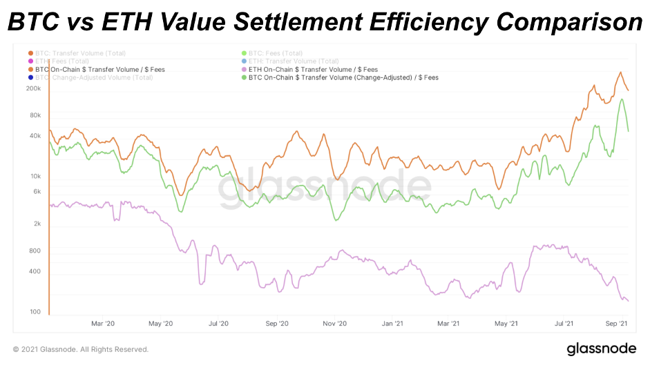 Рассмотрим различные показатели, сравнивающие объём и эффективность расчётов на базовом уровне сетей Bitcoin и Ethereum.