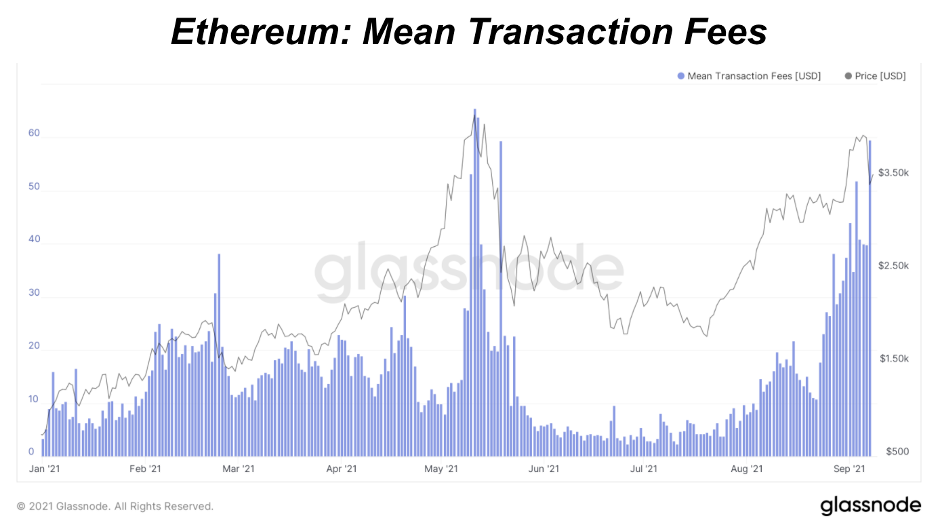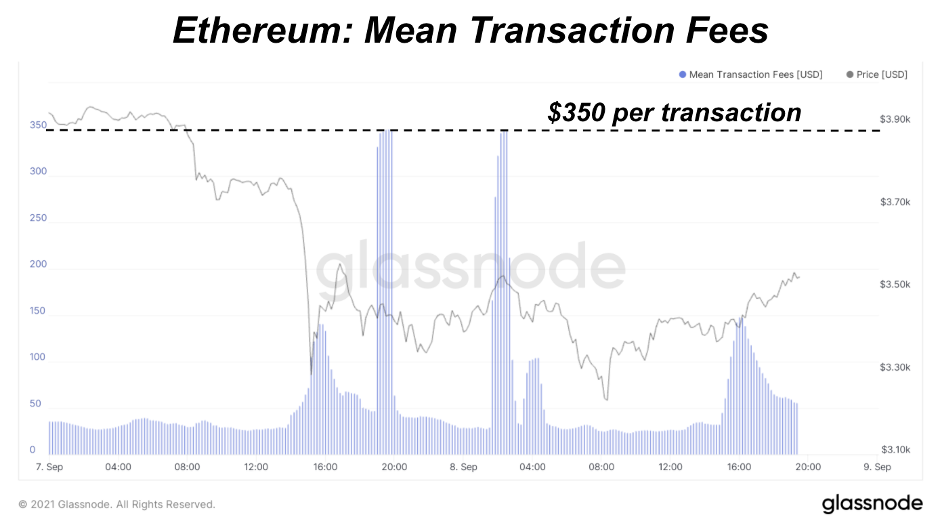 В качестве примера давайте рассмотрим сборы за транзакции в сети Ethereum во время недавнего снижения рынка. В разгар снижения средняя комиссия за транзакции в сети Ethereum достигала $350 за транзакцию, поскольку спрос на блокчейн резко возрос. Это означает, что во время пикового кризиса на рынке, если вам по какой-либо причине потребуется изменить стоимость (т. е. для обеспечения более высокого уровня или входа/выхода с данного рынка), вам придётся заплатить за это в среднем $350.