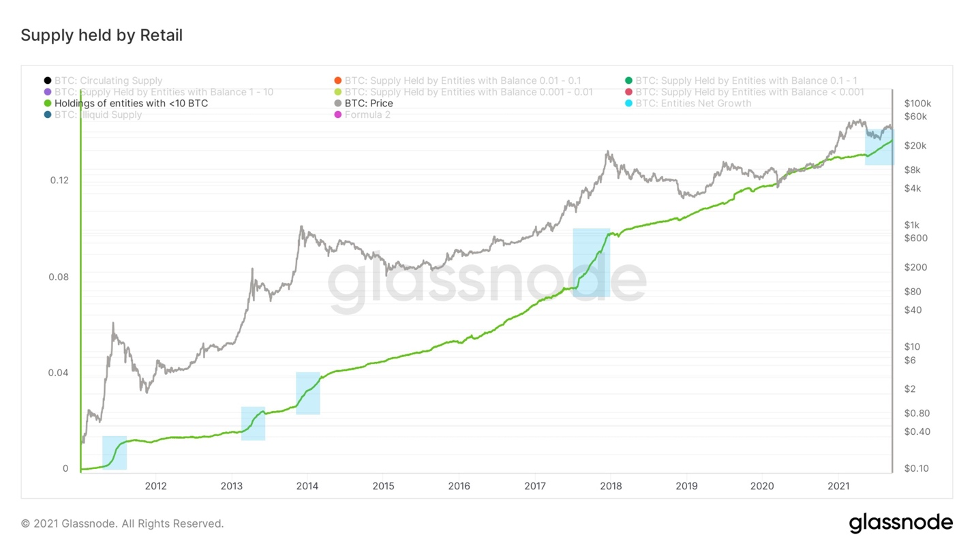 Мелкие участники рынка тоже покупали. Если брать более общую картину, рассматривая долю предложения, принадлежащую рознице, мы видим, что их запасы в настоящее время значительно увеличиваются, аналогично середине каждого предыдущего крупного ценового тренда.