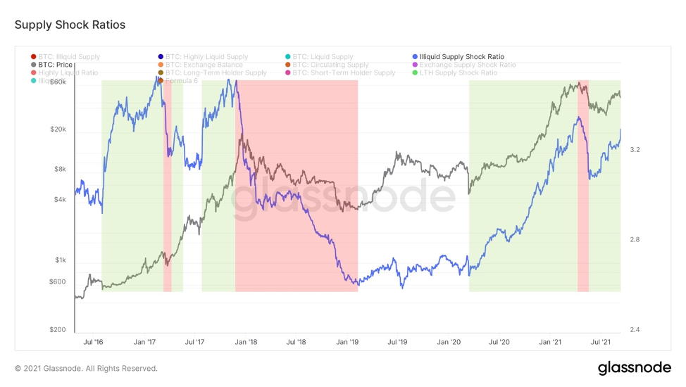 Рассчитывая коэффициент неликвидного предложения с течением времени, мы видим макроизменения в поведении инвесторов, начиная с марта прошлого года. На протяжении всей истории биткойна актив становился всё более спекулятивным, теперь мы наблюдаем, как эта тенденция меняется на противоположную.
