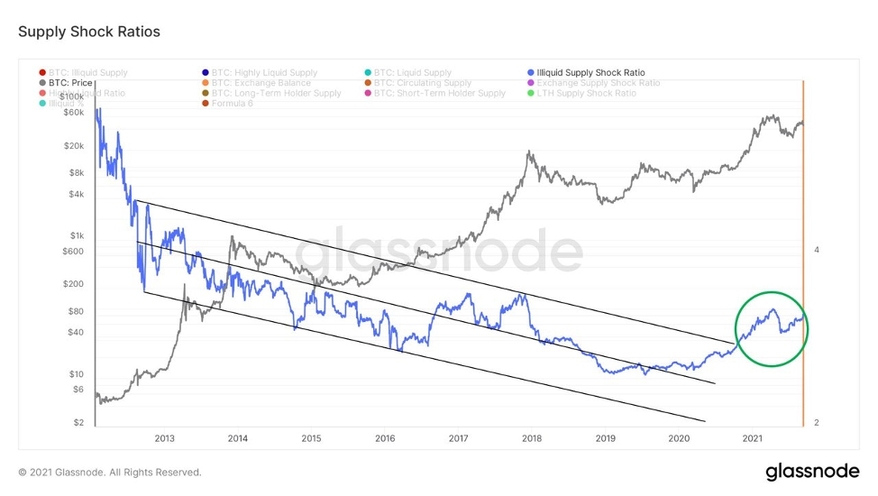 Далее приведён новый показатель, который я создал на этой неделе с помощью моего друга Мэтта Фалтина: Уровень неликвидного предложения (Illiquid Supply Floor). Используя данные Glassnode о неликвидном предложении, эта модель, по сути, пытается оценить уровень, основанный на нехватке биткойнов в реальном времени. Хотя цена действительно ненадолго опустилась вниз в середине 2017 года и в начале этого года, она никогда не оставалась низкой надолго и по-прежнему остаётся актуальной для прокси при оценке уровня. В настоящее время эта цена $38 283.