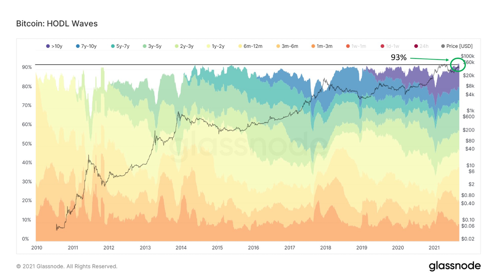 Это также отражается в HODL-волнах, показывающих, что доля предложения не изменилась в каждой временной когорте. 93% предложения не перемещалось по крайней мере месяц, это рекордный показатель за всё время. Объём предложения, которым активно торгуют, находится на рекордно низком уровне.