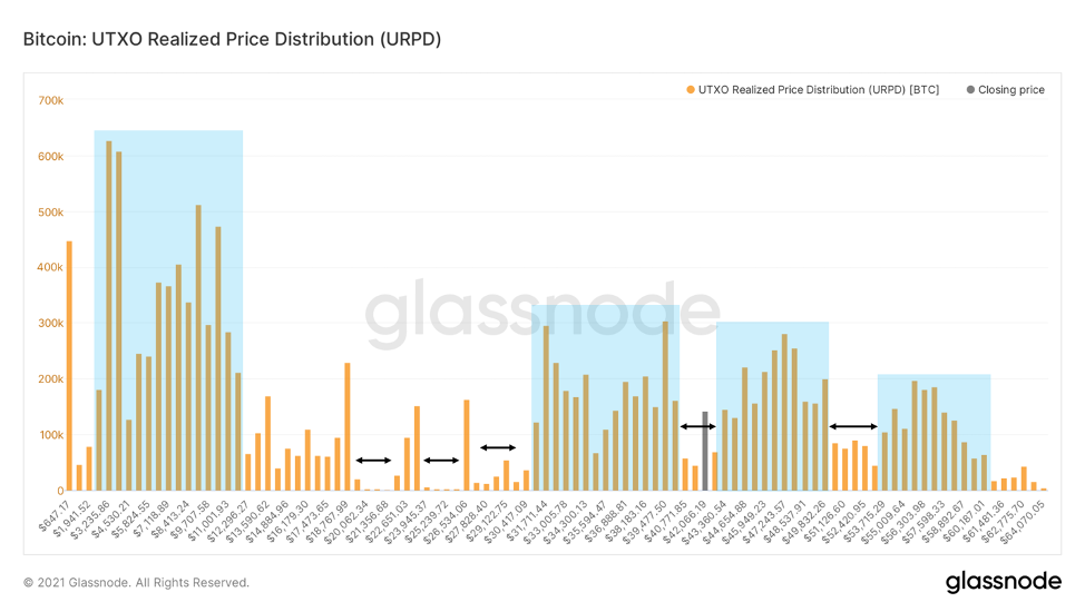 Сначала рассмотрим график URPD, это, по сути, ончейн-объём, показывающий, где были совершены транзакции в больших объёмах BTC. Это может помочь нам оценить, где лежит основа затрат инвесторов, и где находятся зоны спроса. После того как BTC упал на китайских негативных событиях, он находится между двумя большими кластерами объёмов. Будем следить за тем, как цена реагирует либо на верхнем конце кластера ниже (отскочила на прошлой неделе), либо на нижнем конце кластера выше в качестве краткосрочного сопротивления.