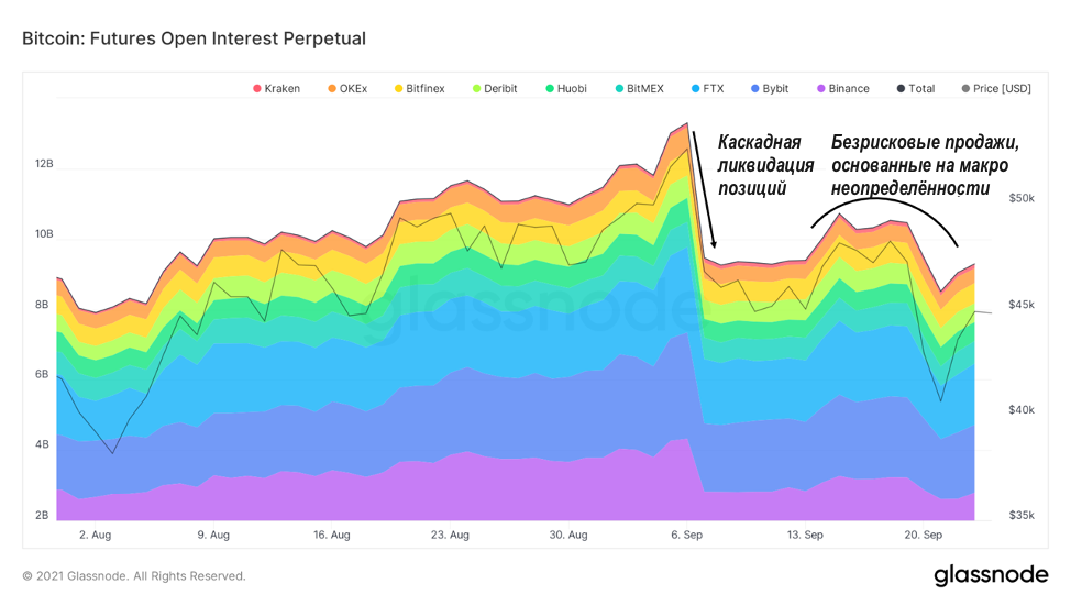 Глядя на количество открытых позиций по фьючерсам, мы видим разницу между каскадными ликвидациями позиций, произошедшими несколько недель назад, и событиями этой недели. Предыдущее событие было в первую очередь обусловлено высоким количеством открытых позиций по фьючерсам, высоким финансированием, что означало большое количество заёмных средств на рынке. Спот был продан достаточно низко, чтобы вызвать стоп-лоссы для трейдеров и бум, инициировавший каскадные ликвидации, резко снизившие количество открытых позиций. Недавняя распродажа казалась гораздо более контролируемой, напоминая поведение трейдеров, склонных к риску из-за макроэкономической неопределённости.