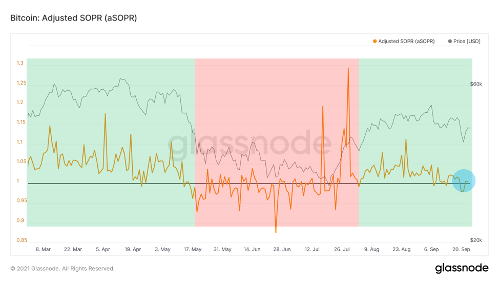 Во время распродажи в начале этой недели рынок поглотил примерно $650 млн чистых реализованных убытков в понедельник/вторник. Это были первые последовательные дни чистых реализованных убытков с начала июля. Поскольку рынок восстановился до состояния реализованной чистой прибыли, мы всё же хотим убедиться в его устойчивости, и это очень похоже на то, как мы рассматриваем SOPR (коэффициент прибыльности потраченного выхода).