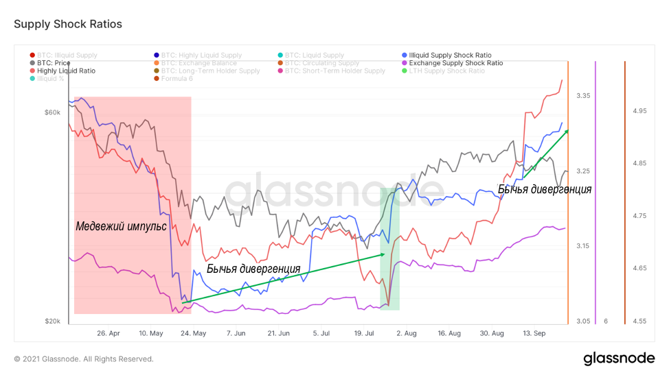 Далее рассмотрим метрики, относящиеся к модели шока предложения. Долгосрочные инвесторы продолжают блокировать BTC, несмотря на цену. Мы видели очень похожее расхождение ещё в июне/июле, когда призывали к развороту с минимума в $30 тыс. На этой неделе биржи имели некоторый чистый приток средств, особенно в понедельник/вторник в Binance; в общей сложности +4586 BTC (~ $190 млн).