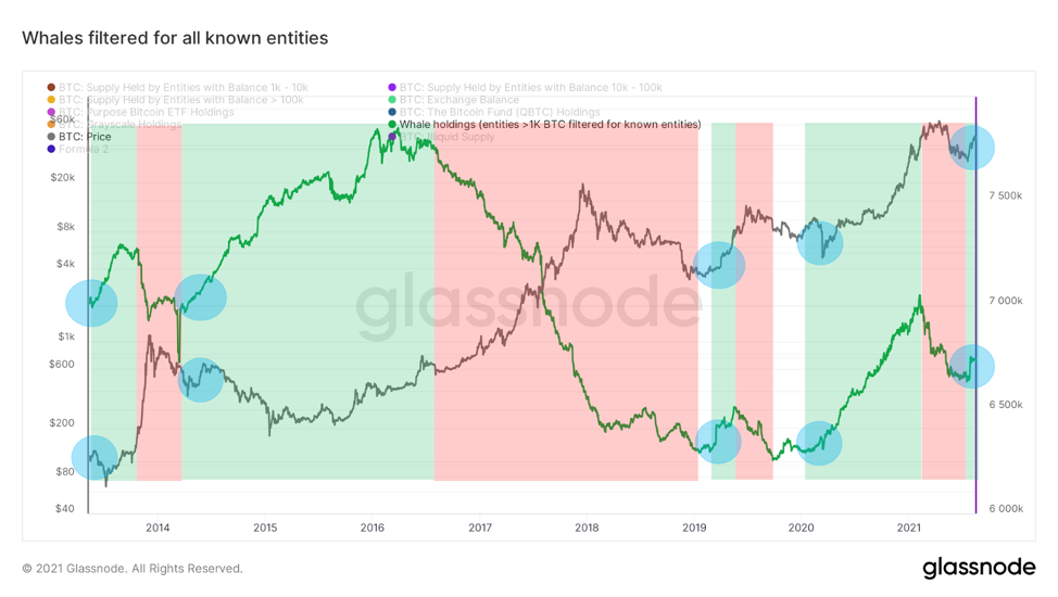 Киты покупают и покупают с середины июля. При уменьшении масштаба мы видим, что следование тенденциям китов было жизнеспособной идеей. Эти крупные игроки, как правило, покупают на ранней стадии восходящего тренда и начинают продавать, когда он окрепнет.