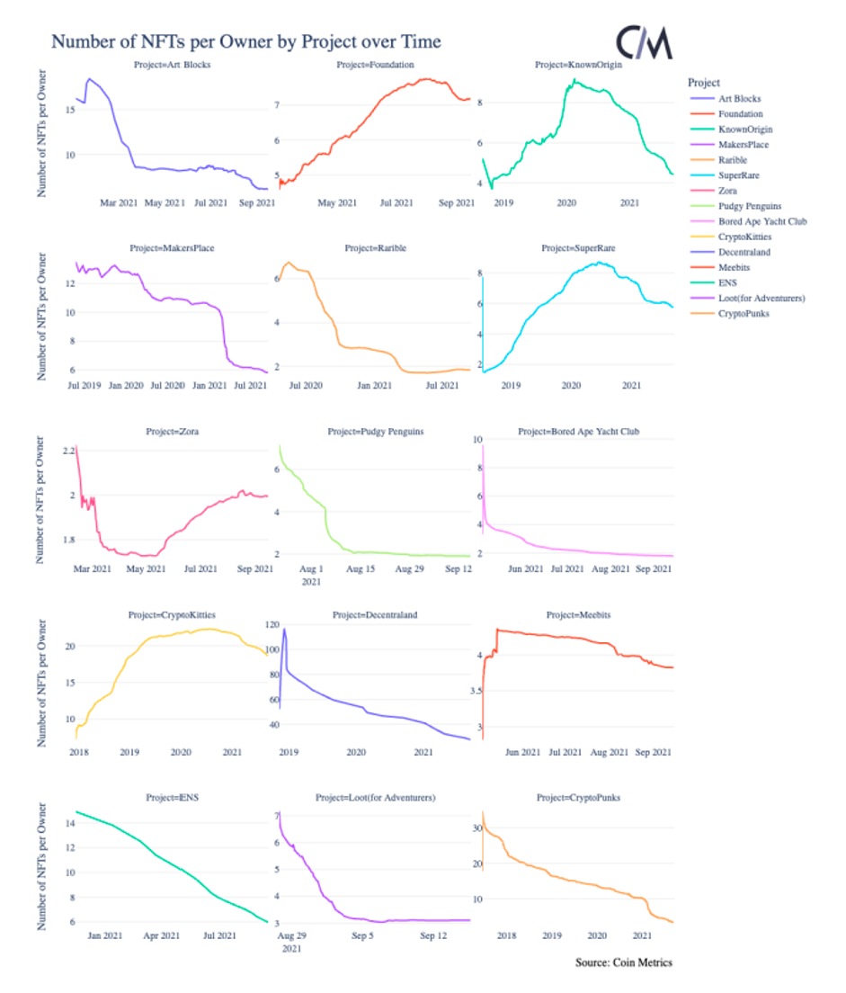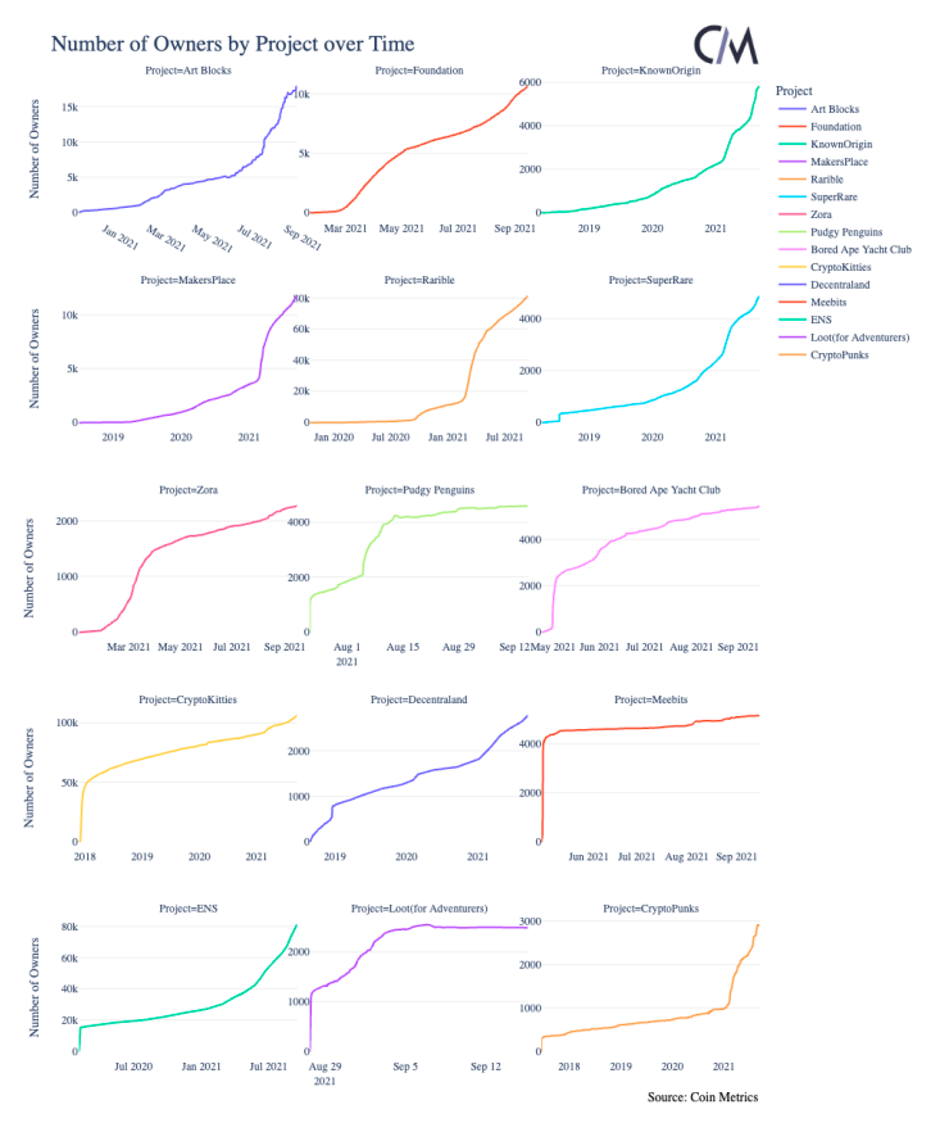 В течение 2021 года количество уникальных адресов ETH, владеющих NFT, увеличилось вместе с предложением NFT на популярных платформах (без заранее установленных размеров коллекции). На приведённых ниже графиках показано уникальное количество владельцев для каждого проекта с течением времени.