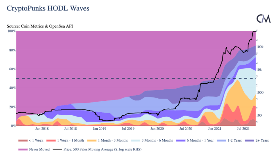 Ниже приведены HODL-волны для коллекции криптопанков. Каждая цветная полоса указывает процент предложения криптопанков, которые перемещались (необязательно продавались) за этот период времени. Предложение криптопанков было самым активным за всю историю в 2021 году. В конце мая около 50% из 10 тыс. криптопанков переместились за последние 3 месяца (жёлтые+красные+тёмно-красные полосы), что подтверждает рост числа уникальных владельцев панков выше. Однако в последнее время диапазон 6-12 месяцев растёт, что может свидетельствовать о том, что покупатели с начала этого года рассматривают криптопанков как активы для хранения.