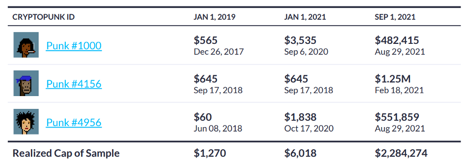 CryptoPunks — интересный кейс, поскольку демонстрирует сложность поиска разумной методологии рыночной капитализации для NFT. Как упоминалось выше, сложность с криптопанками заключается в том, что только около 63,5% всех панков в коллекции когда-либо продавались. Таким образом, простая реализованная капитализация, рассчитанная выше, исключила бы эти криптопанки, потому что у них нет самой последней продажи. Однако эти NFT явно имели бы рыночную цену, если бы они были перечислены и проданы.