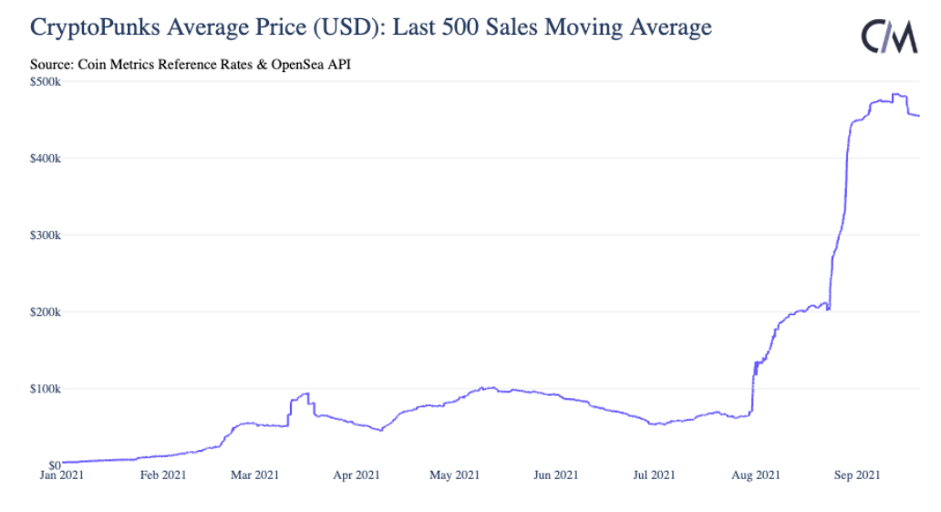 Реализованная капитализация отражает бум рынка NFT этим летом и утроилась с $250 млн в начале августа. Средняя цена CryptoPunk увеличилась со ~$100 тыс. в начале августа до ~$455 тыс. сегодня (последние 500 продаж). Общая стоимость всех продаж криптопанков на сегодняшний день составляет чуть более $1,3 млрд, половина из которых произошла с 6 августа 2021 года.