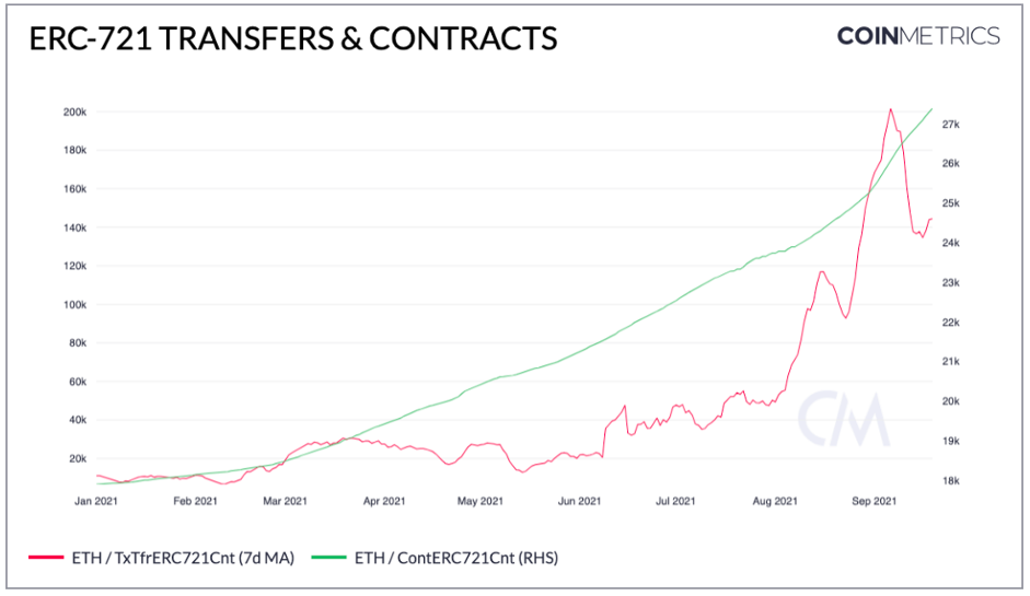 Ежедневное количество трансферов ERC-721 выросло с 11 тыс. в начале 2021 года до 144 тыс. сегодня, несмотря на недавний спад активности. Количество смарт-контрактов на Ethereum, реализующих стандарт ERC-721, на сегодняшний день также увеличилось с ~ 18 тыс. до ~ 27 тыс. Это небольшая часть 20-миллионных смарт-контрактов на Эфириуме, но процент контрактов, соответствующих стандарту ERC-721, в целом растёт.
