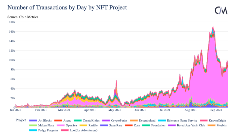Для каждого проекта мы определили общее количество ежедневных транзакций, связанных с соответствующими адресами этого проекта. Включает каждый раз, когда этот адрес участвует в журнале событий транзакции. Примечание. В некоторых случаях два или более адресов контрактов могут быть включены в один и тот же журнал событий (например, продажа CryptoPunk в OpenSea). Но поскольку многие из вышеперечисленных проектов имеют свои собственные торговые площадки, это влияние должно быть минимальным. Глядя на ежедневное количество транзакций по проектам, очевидно, что большая часть возросшей активности может быть связана с ростом OpenSea как ведущего рынка для покупки, продажи и создания NFT. В других проектах также наблюдался заметный рост, такой как рост популярности художественных блоков проекта генеративного искусства Art Blocks в августе 2021 года. Кроме того, всплеск активности в конце апреля в значительной степени можно объяснить запуском аватар-проектов Bored Ape Yacht Club и Meebits, которые стартовали 30 апреля и 3 мая соответственно.