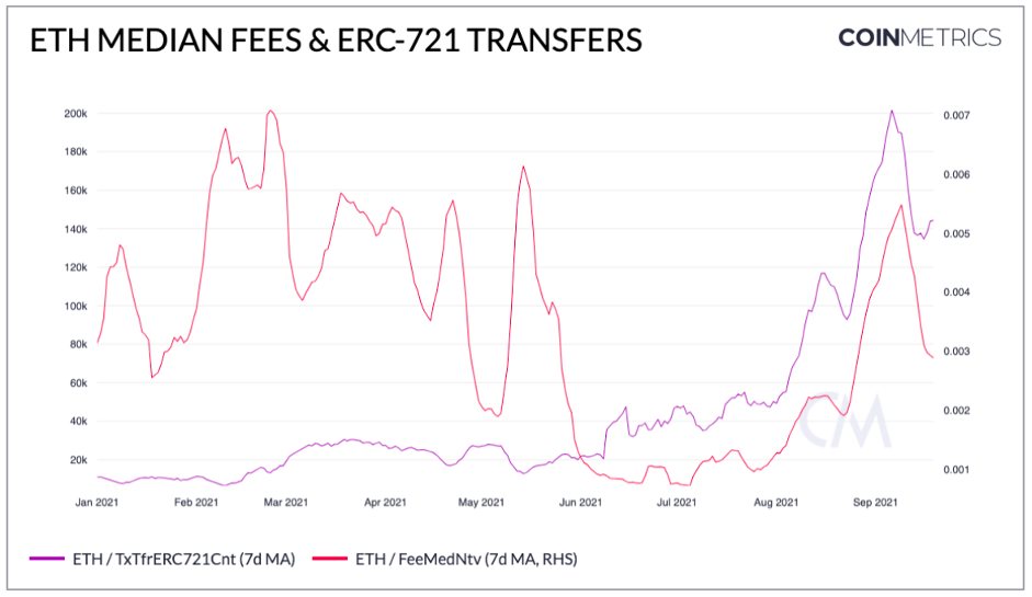 Но наблюдение за этими закономерностями не подтверждает причинно-следственных связей. В конечном счёте, Эфириум — это сложная сеть со значительной ежедневной активностью в областях за пределами NFT, таких как стейблкойны и DeFi. Кроме того, введение EIP-1559 в августе коренным образом изменило механизм оплаты Ethereum, усложнив более широкий анализ. Попытка установить причинно-следственные связи на макроуровне между NFT и общей рыночной ценой блокчейна Эфириума должна быть очень тщательной.