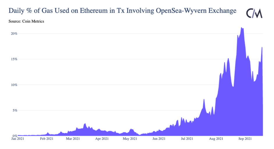 Хотя трудно установить широкие причинно-следственные связи, OpenSea была одним из крупнейших источников потребления газа в сети Эфириума в последние пару месяцев. В конце августа около одной пятой всего ежедневного газа, используемого в Эфириуме, включало транзакции, взаимодействующие с контрактом OpenSea Wyvern Exchange. Включает любую транзакцию, в которой адрес контракта OpenSea Wyvern Exchange (0x7be8076f4ea4a4ad08075c2508e481d6c946d12b) указан в журнале событий Ethereum.