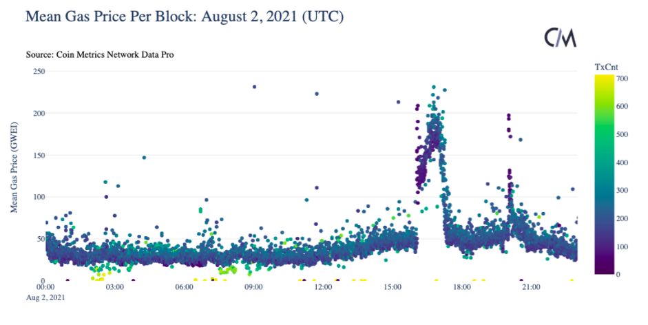 Влияние NFT на плату за газ лучше всего анализировать на более детальном уровне после выделения специфических событий. В частности, запуск новых проектов NFT (часто называемых “падениями”) может привести к быстрым, но кратковременным скачкам платы за газ, поскольку пользователи спешат создавать или требовать NFT. Например, 2 августа в 16:00 по Гринвичу на платформе генеративного искусства Art Blocks Factory была запущена новая коллекция под названием «Цветы». На приведённом ниже графике показано, что средняя цена на газ за блок 2 августа резко возросла в 4 часа дня, так как многие требовали выпустить новые NFT.