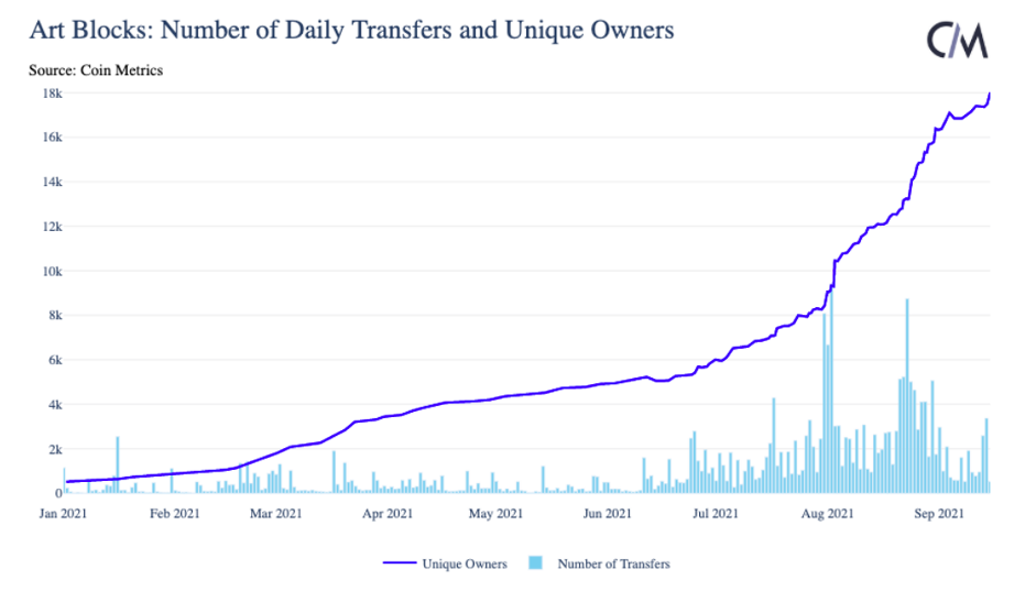 2021 год привёл к появлению всего, от фондов NFT до компонента S&P 500, приобретающего NFT более чем за $100 тыс. Хотя фонды, сфокусированные на NFT, в основном предназначались для существующих ориентированных в сторону криптовалюты инвесторов, наблюдалась некоторая интригующая активность. В августе сингапурский хедж-фонд Three Arrows Capital разместил тысячи ETH для покупки NFT на рынке Art Blocks. Примерно в это же время стали популярны ежедневные трансферы и уникальные владельцы Art Block.