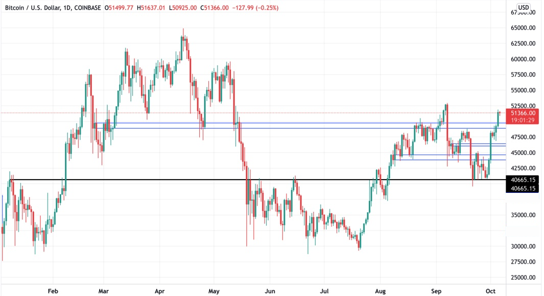 Что касается технических характеристик, цена пробила сопротивление в $45 тыс. Это бычий настрой. Окончательный уровень сопротивления расположен около $50 тыс., и в настоящее время он тестируется. Не лучшее место для открытия новых длинных позиций от уровня сопротивления, однако локация котировок на дневном таймфрейме выше $50 тыс., скорее всего, приведёт к продолжению импульса к вершине диапазона ($60 тыс., с некоторыми промежуточными областями).