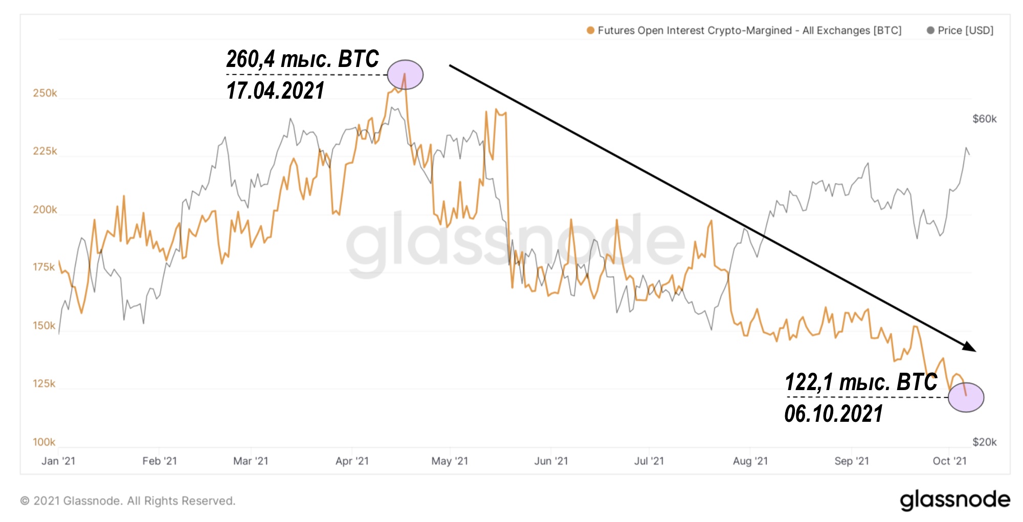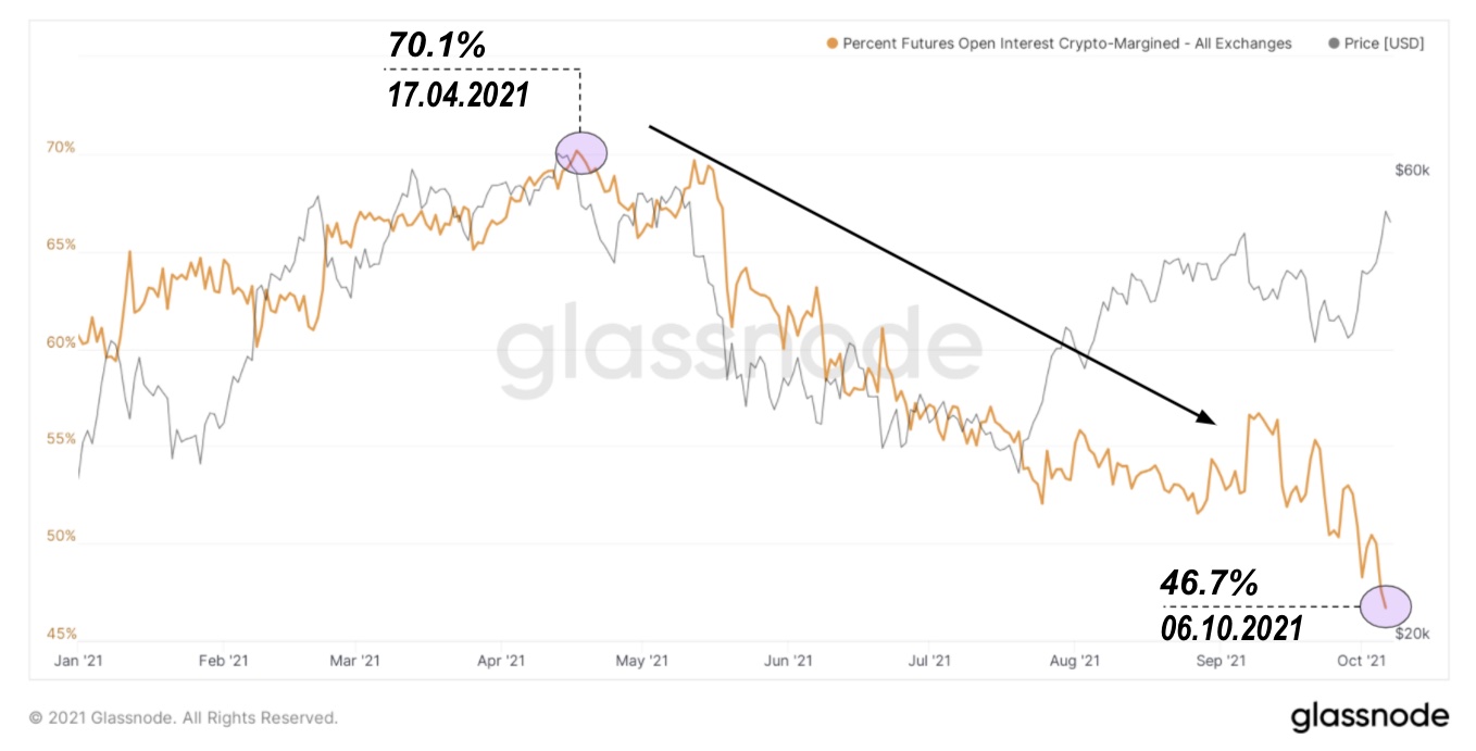 С апреля, когда была установлена локальная вершина, рынок деривативов на биткойн пребывает в процессе системного перехода к фьючерсам с маржированием наличными (доллар и стейблкойны), вместо фьючерсов с маржированием в BTC, доминировавших на рынке до того (70% открытого интереса по состоянию на апрель 2021).