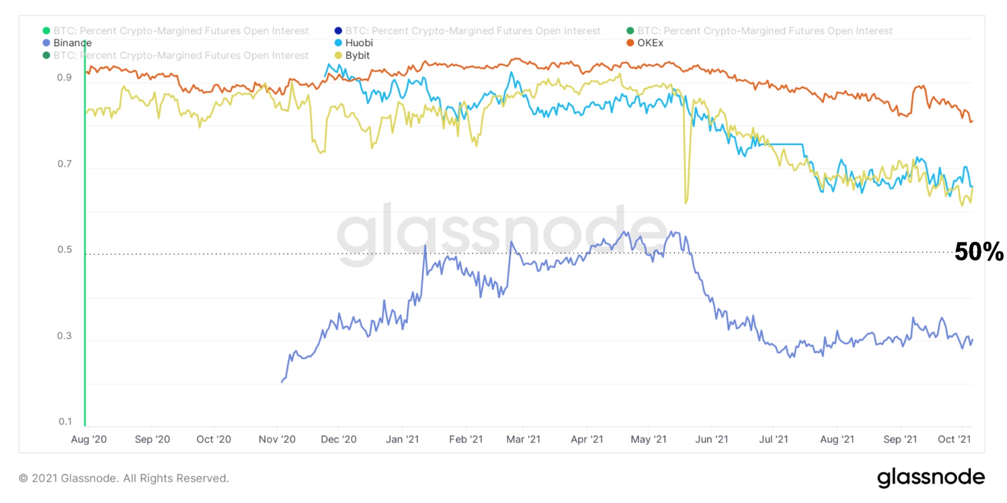 Хотя отчасти это изменение может объясняться ростом открытого интереса с маржированием наличными, причиной структурного сдвига является скорее резкое сокращение общего открытого интереса с маржированием в BTC, произошедшего на всех биржах деривативов. В значительной мере это изменение было обусловлено активностью Binance, в то время как на остальных ключевых биржах (ByBit, Huobi и OKEx, предлагавших контракты с маржированием и в BTC, и в стейблкойнах) доля открытого интереса, маржированного в BTC, оставалась выше 50%.