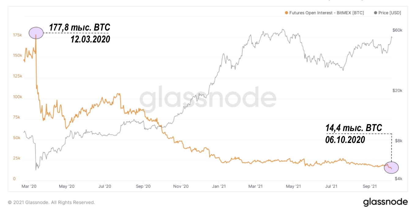 Также нельзя не отметить, что существенную роль в изменении структуры рынка сыграло падение BitMEX. BitMEX первой ввела торговлю бессрочными свопами в 2016 году и долгое время оставалась одной из крупнейших бирж деривативов, но каскадные ликвидации деривативов в марте 2020, обвинения в адрес основателей в октябре прошлого года, введение обязательного прохождения KYC для пользователей и постепенный общий сдвиг рынка в направлении фьючерсов с маржированием наличными привели к тому, что общий открытый интерес на платформе в пересчете на BTC снизился более чем на 90%.