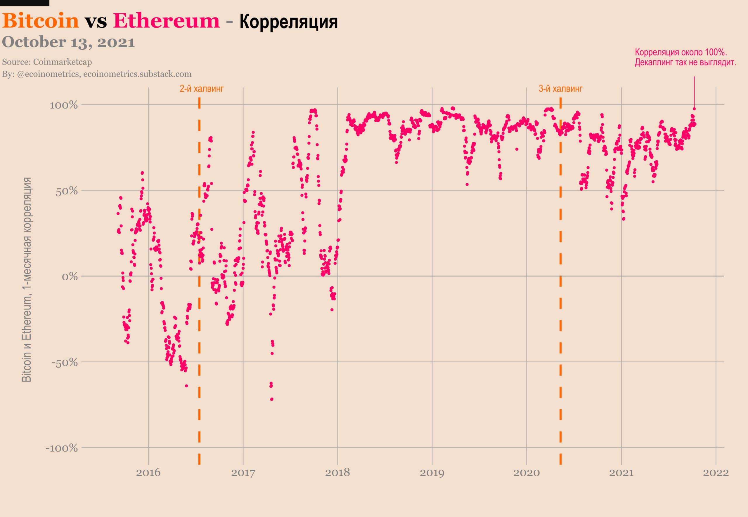 Что я хочу сказать, это то, что мы, очевидно, еще не достигли того момента, когда web3 становится настолько большим, что курс ETH начинается двигаться независимо от BTC. На мой взгляд, это снижает вероятность смены («флипа») лидера криптоотрасли в сколько-нибудь обозримом будущем.