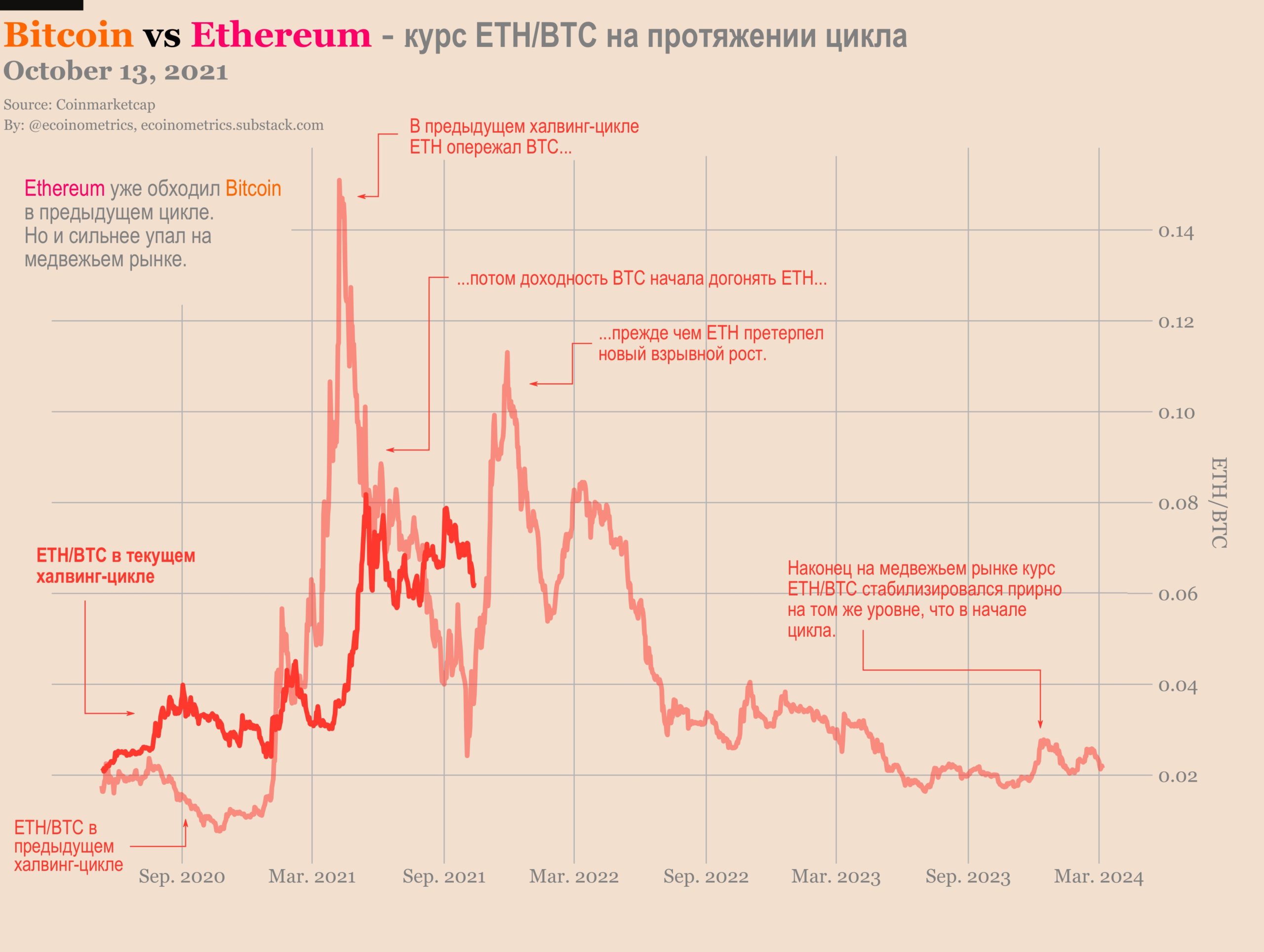 И хотя в этом цикле ETH рос быстрее, чем BTC, котировки в паре ETH/BTC остаются намного, намного ниже рекордных максимумов 2017 года.
