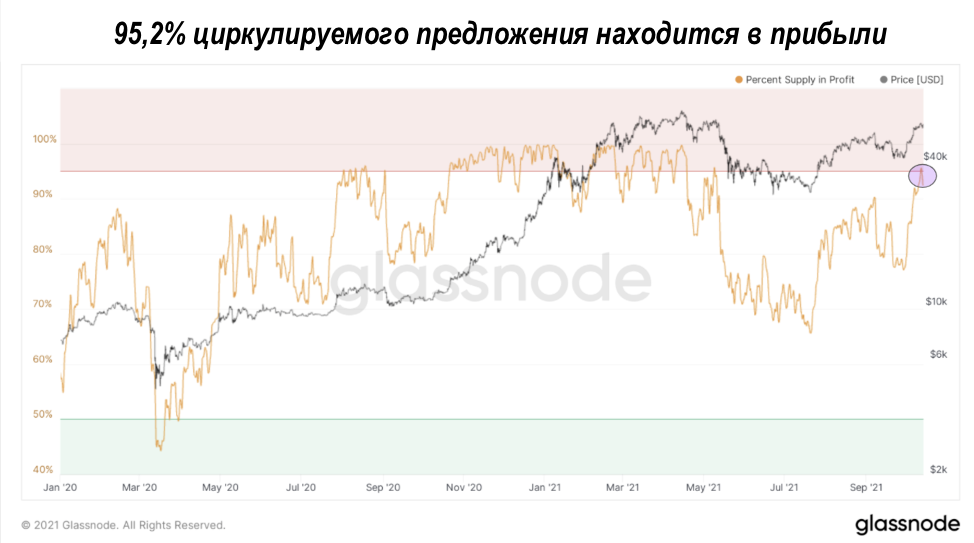 В настоящее время 95,2% всего объёма биткойнов приносит прибыль. Во время максимальных подъёмов бычьего цикла предложение может достигать более 95% прибыли в течение нескольких недель перед снижением. Даже после этих просадок более крупный тренд может сохраняться в течение нескольких месяцев во время бычьих циклов.