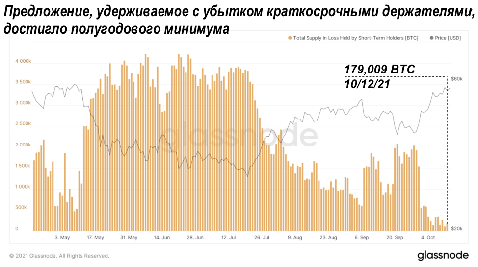 Предложение биткойнов, удерживаемых с убытком, достигло шестимесячного минимума. Это ещё раз показывает, как мало стоит на пути между новыми рекордными максимумами; любой держатель, который желает выйти из безубыточности, скорее всего, получит такую возможность в ближайшие дни/недели.