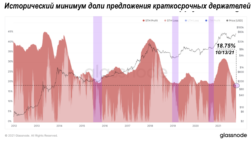 Другой (обратный) вид, показывающий процент краткосрочного предложения держателей, показывает сокращение предложения, происходящее в настоящее время. Исторически сложилось так, что, когда краткосрочное предложение держателей приближается примерно к 20%, биткойн движется наверх. Пресловутая пружина выглядит такой же сжатой, как и всегда.