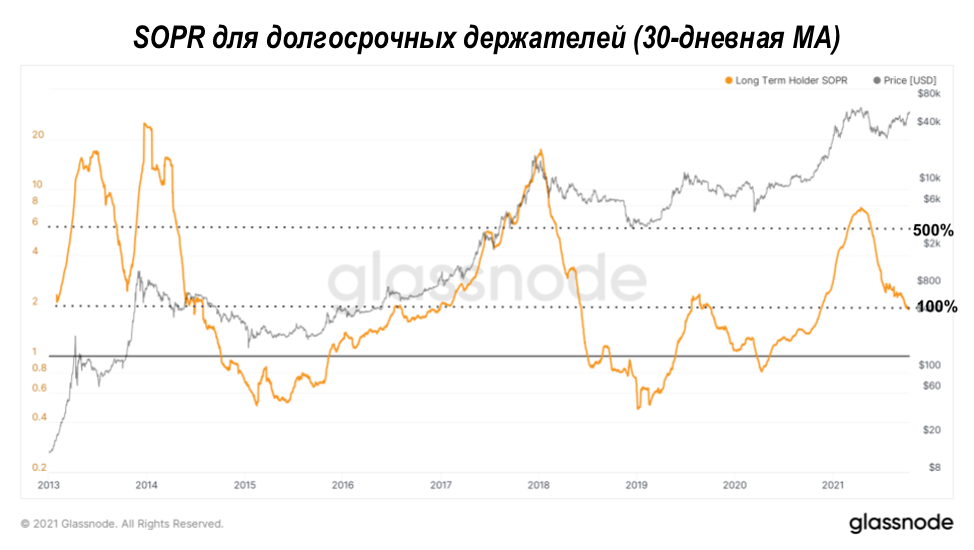 Если посмотреть на коэффициент прибыльности потраченного выхода долгосрочного держателя (цена продажи, превышающая уплаченную цену), мы увидим, что в прошлом прибыль достигала более 500% во время максимумов бычьего цикла и во время последнего рекордного максимума. В настоящее время мы примерно на 100% используем 30-дневную скользящую среднюю. Это говорит о том, что текущий уровень цен недостаточно высок для долгосрочных держателей, чтобы реализовать максимальную прибыль от бычьего цикла, как это было в прошлом. Цена биткойна должна вырасти намного больше, прежде чем у держателей появится стимул получать прибыль.