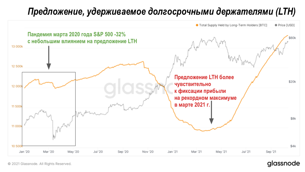 Это связано с тем, что общая базисная стоимость долгосрочных держателей значительно возросла за последние несколько месяцев, о чём мы недавно писали. Базисная стоимость увеличилась по мере того, как долгосрочные держатели нарастили свои позиции со скоростью, которую мы никогда раньше не видели, после снижения до $30 тыс. Кроме того, долгосрочные держатели были гораздо более склонны к получению прибыли во время новых рекордных максимумов, чем к распродаже во время макрокоррекции в марте 2020 года.