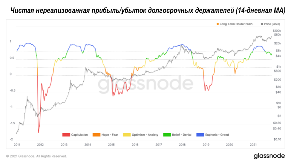 В настоящее время мы находимся ниже отметки 0,75, где исторически наблюдается эйфория и жадность в части цикла, когда наибольшая прибыль извлекается на вершинах цикла. Во время небывало высокого роста цен показатель был выше 0,75 в течение шести месяцев, сигнализируя о первой вершине потенциального цикла бычьего рынка с двойной вершиной.