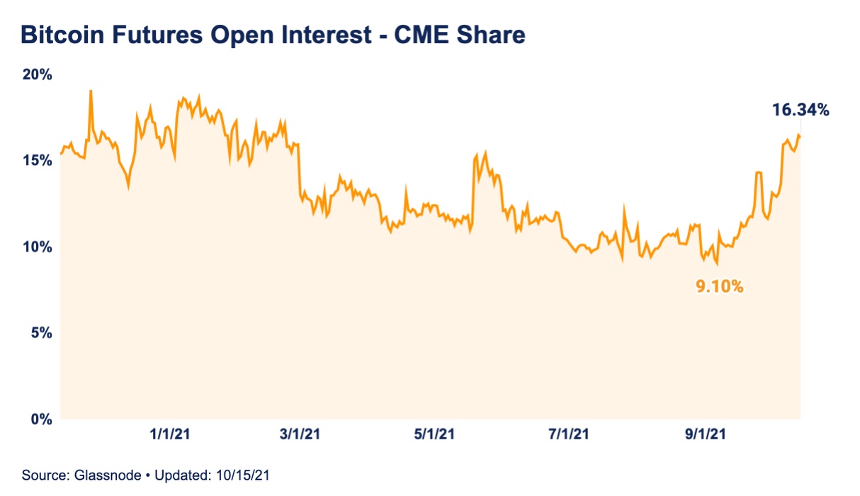 В последние несколько недель наблюдался повышенный спрос на открытие позиций по фьючерсам, особенно на CME, доля которой в общем объеме открытого интереса по фьючерсам на BTC выросла с 9,10% до 16,34%. Это 3,24 млрд из 19,84 млрд общего открытого интереса. В последний раз такой уровень общего открытого интереса мы видели в апреле и мае, в условиях чрезмерного используемого левериджа по длинным позициям с обеспечением в BTC и с последовавшими каскадными ликвидациями на рынках криптодеривативов. Однако в этот раз все по-другому, и об этих структурных изменениях мы рассказывали, в частности, в этом большом отчете за сентябрь.
