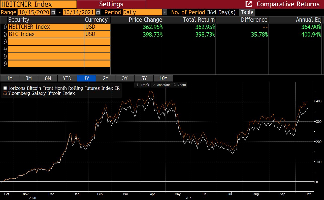 Поскольку для переноса позиций фьючерсные контракты необходимо пролонгировать, продавая и покупая их каждый месяц, то, пока фьючерсы торгуются с контанго по отношению к споту, получается, что вы регулярно покупаете биткойны по более высокой цене. Для примера, тест на исторических данных за последний год показывает, что удержание с постоянным продлением позиции в ETF по фьючерсам на биткойн принесло бы за это время на 35,78% меньше прибыли, чем простое удержание спотового BTC. Однако прибыль все равно составила бы более 360%, так что для многих инвесторов такая альтернативная стоимость может и вовсе не иметь значения, если понимание и самостоятельное хранение биткойнов является для них большей проблемой.