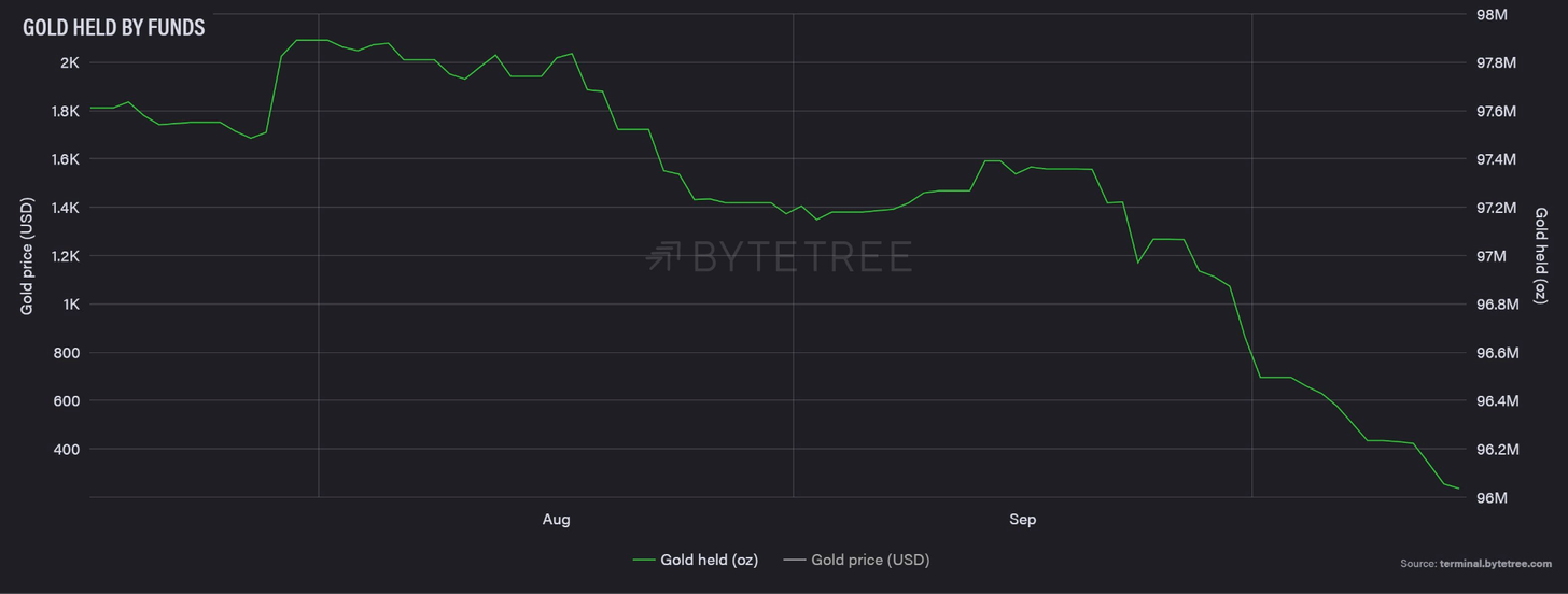 Еще одна интересная динамика, наблюдавшаяся на фоне ожидания фьючерсного ETF, состояла в увеличении доли ETF и фондов в общей структуре владения BTC: за сентябрь и октябрь она выросла до 4,3% от общего циркулирующего предложения. Только за первую половину октября в финансовые продукты на основе биткойна уже перетекло более 5364 BTC. В то же время финансовые потоки в ETF на золото, считающиеся важным сигналом для институционального спроса, сокращаются с августа, сопровождаясь ростом в ETF на биткойн.