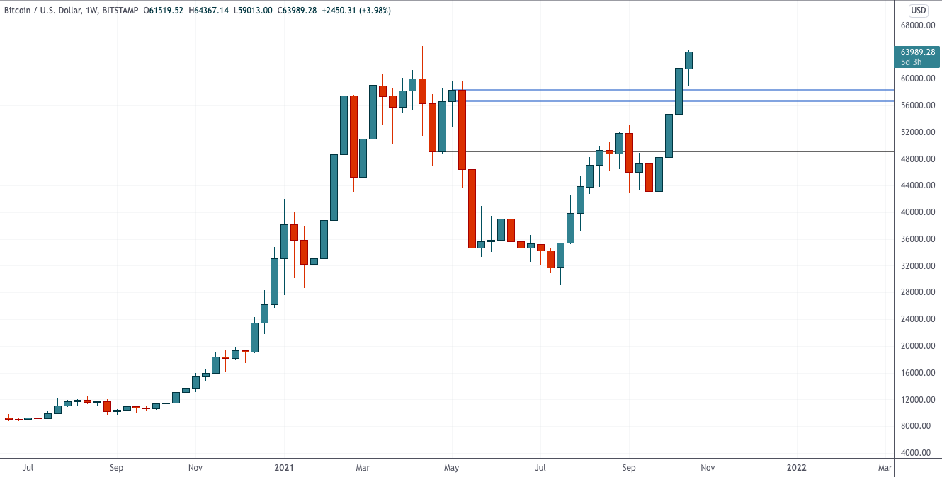Курс биткойна шел вверх, можно сказать, по прямой и после самого высокого недельного закрытия в истории похоже, что готов еще продолжать и продолжать. Кроме того, это движение полностью опровергает нарратив о «плече самодовольства», и даже самые упертые «медведи» теперь, вероятно, ищут возможности для покупки.