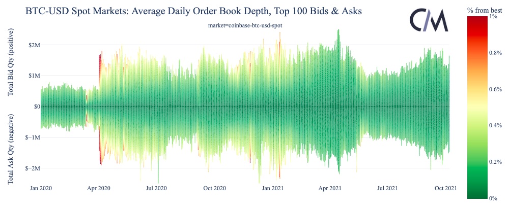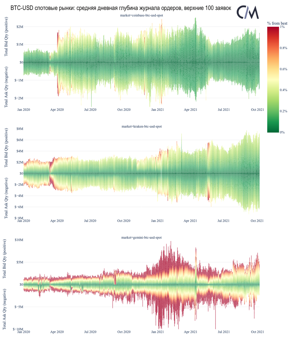 На приведённой ниже диаграмме показана средняя дневная глубина рынка и расстояние от лучшей заявки на покупку/продажу для спотовых рынков BTC-USD для трёх выбранных бирж. На оси y положительные значения показывают общую стоимость ордеров на покупку (в долларах США), в то время как отрицательные значения показывают общую стоимость ордеров на продажу. Цветовая шкала показывает, находятся ли предлагаемые заявки по ценам, очень близким к среднему рынку (тёмно-зелёный, ближе к 0%) или далеко от него (тёмно-красный, с ограничением в 1%).