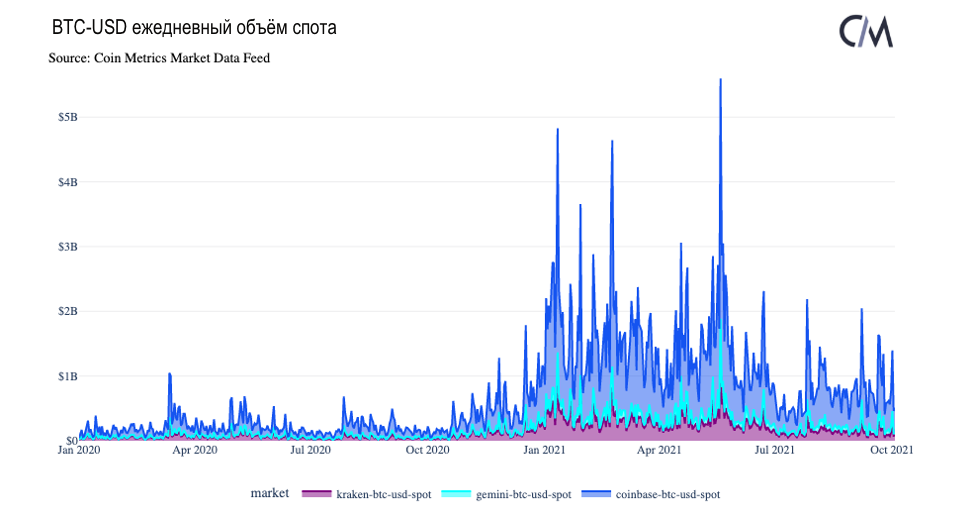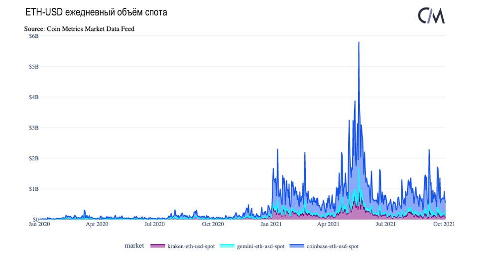 Как и BTC, объём спотовой торговли ETH на этих биржах также коррелирует с биржами с более высокой рыночной ликвидностью. Общий объём торгов ETH резко возрос в 2021 году, при этом общий объём ETH-USD на Coinbase во 2 и 3 кварталах заметно превысил объём BTC-USD (2 квартал: $89 млрд против $87 млрд, 3 квартал: $53 млрд против $49 млрд).