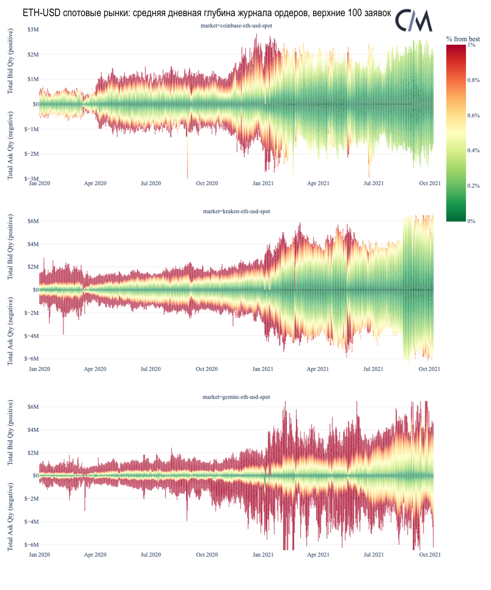 Как и BTC, ETH переживает трансформационный 2021 год, и данные журнала ордеров указывают на его зрелый рынок. Мы рассчитали среднюю дневную глубину рынка для спотовых рынков ETH-USD на Coinbase, Kraken и Gemini.