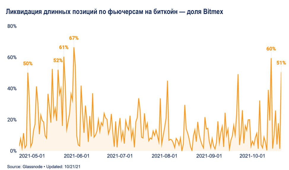 Если вы в лонге (направленно делаете ставку на повышение цен) на биткойн, то, когда цена уменьшает вашу позицию прибыли и убытка, и ваше обеспечение уменьшается в стоимости в тандеме, это повышает ликвидационную цену вашей позиции. Это может привести к массовым ликвидационным мероприятиям, подобным тем, что произошли в мае после достижения апрельских максимумов.