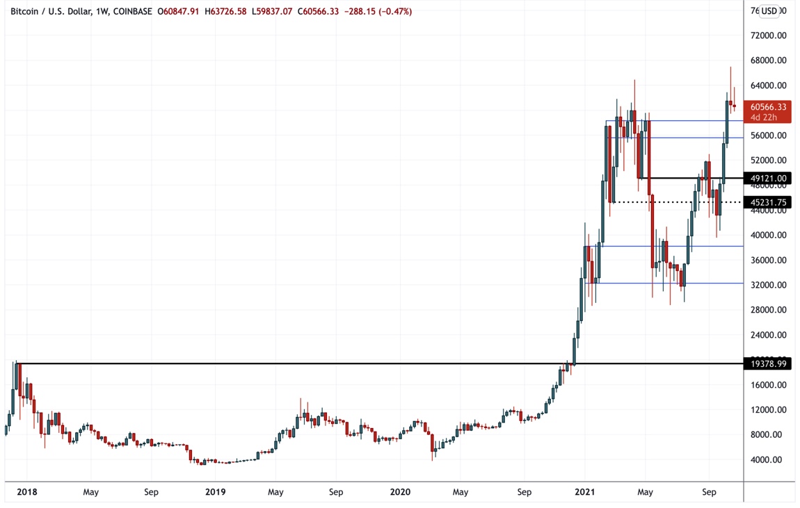 Цена закрылась выше недельного максимума $58 тыс. Ожидается, что вся эта область (диапазон от $56 тыс. до $58 тыс.) теперь будет выступать в качестве поддержки. Хотя движение рынка наверх является вполне разумным сценарием, учитывая близость к рекордным максимумам, следует иметь резервный план действий на случай неудачи.
