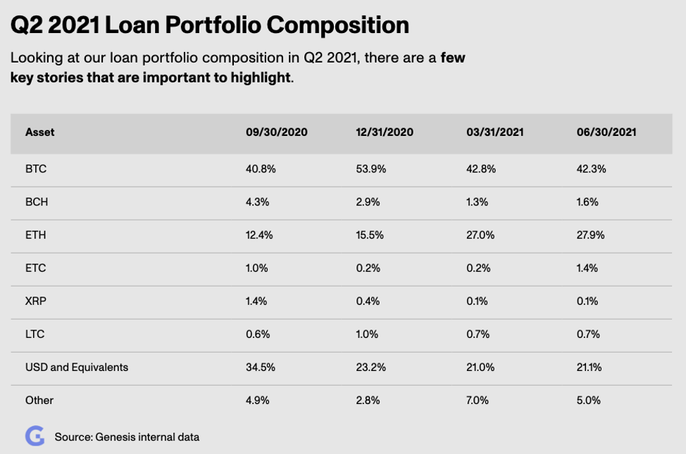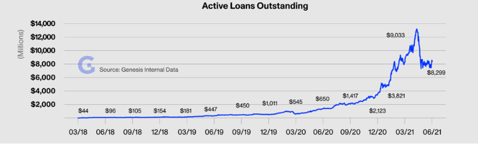За пределами традиционной банковской системы мы наблюдаем повышенный уровень спроса на кредиты, номинированные в биткойнах, и биткойны в качестве обеспечения как для торговли, так и для кредитования. Один из примеров — это рост кредитного портфеля Genesis по кредитованию цифровых активов. По состоянию на 2 квартал, в портфеле было $8,3 млрд активных непогашенных кредитов, при этом 42,3% этих кредитов номинированы в биткойне на сумму $3,5 млрд.