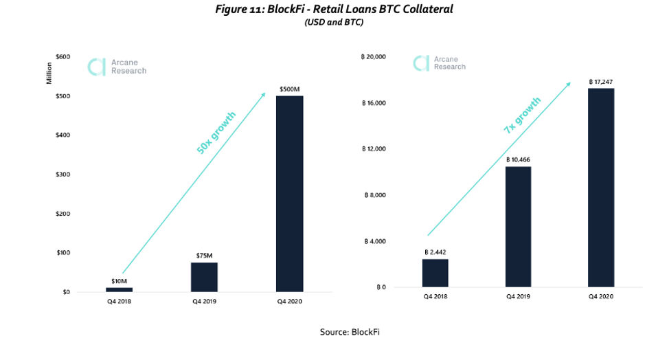 BlockFi — это ещё одна компания, в которой очевиден рыночный спрос, и благодаря тому, что BlockFi поделился данными в отчёте с Arcane Research (PDF, англ.), можно увидеть 50-кратный и 7-кратный рост спроса на обеспечение розничных кредитов в биткойнах за последние два года, выраженный в долларах США и в биткойнах соответственно.