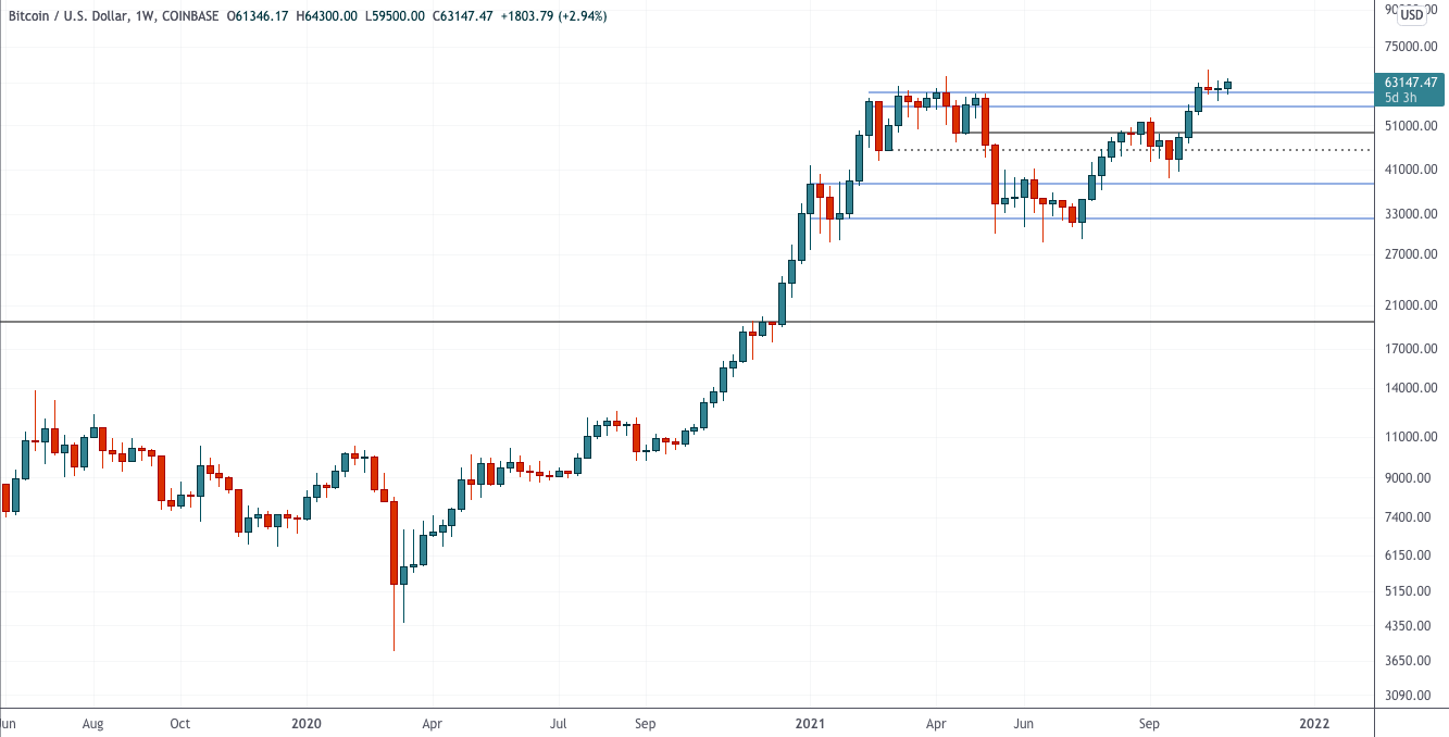Курс биткойна к доллару с прошлого выпуска, в сущности, не сдвинулся с места. Рынок протестировал и закрылся выше важной недельной поддержки ~$58 тыс. С точки зрения ТА, картина остается «бычьей».