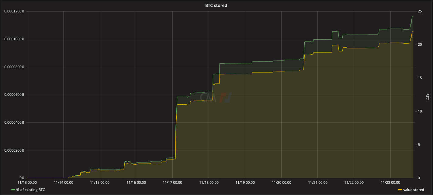 Статистика реального использования же пока весьма скромна: на сегодняшний день на P2TR-выходах хранится немногим более 20 BTC.