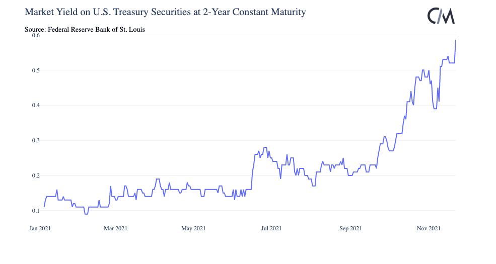 В краткосрочной перспективе дополнительное давление на крипторынок может оказываться также изменением макроэкономических условий. Доходность облигаций США, особенно казначейских с коротким сроком погашения, в последние несколько недель резко выросла. По двухлетним облигациям доходность выросла с 0,24% на 22 сентября до почти 0,60% по состоянию на 23 ноября на фоне усиления ожиданий дальнейшего повышения процентных ставок. Назначение нынешнего председателя ФРС Джерома Пауэлла на второй срок также способствовало повышению доходности. Поскольку криптоактивы, как и быстрорастущие акции технокомпаний, обычно воспринимаются как рисковые активы, увеличение «безрисковой» ставки может приводить к перераспределению капитала на финансовых рынках.