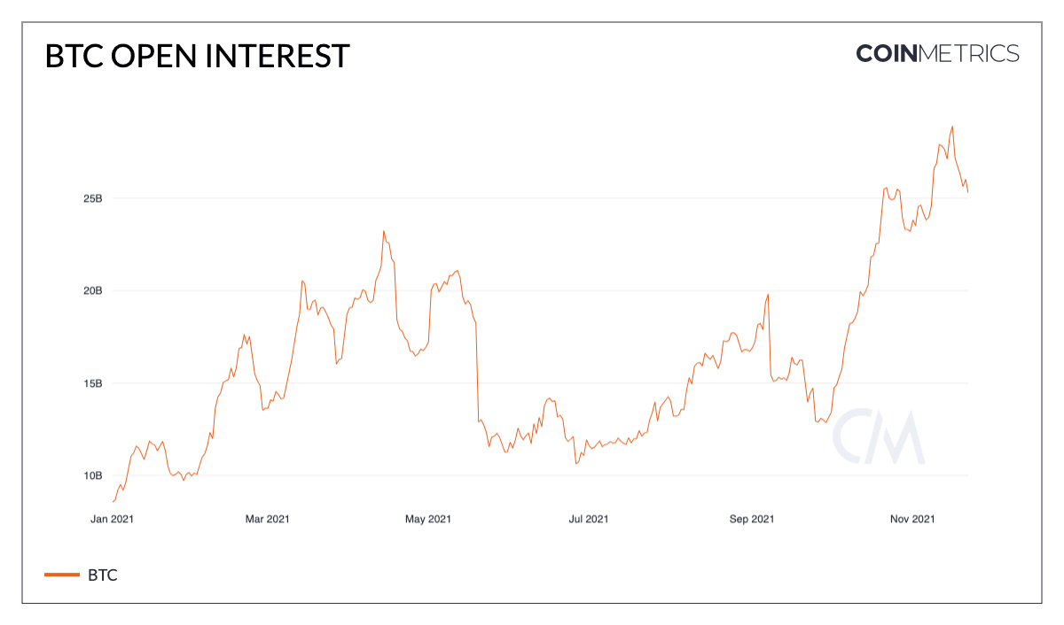Открытый интерес часто может служить также хорошей замещающей переменной для уровня левериджа (использования заемных средств) на рынке, поскольку многие фьючерсные контракты, как правило, открываются с кредитным плечом. Отчасти рост открытого интереса по BTC может объясняться запуском первого в США фьючерсного ETF на биткойн, хотя весьма вероятно, что во многом дело в росте уровня левериджа на фоне связанного с этим оптимизма на рынке. Рост уровня левериджа на рынке означает, что меньшие колебания цены могут спровоцировать бо́льшую волатильность за счет ликвидаций «перекредитованных» позиций на фьючерсных рынках. Со снижением цены на прошедшей неделе начал сокращаться и открытый интерес в связи с давлением, оказываемым на активные длинные позиции.