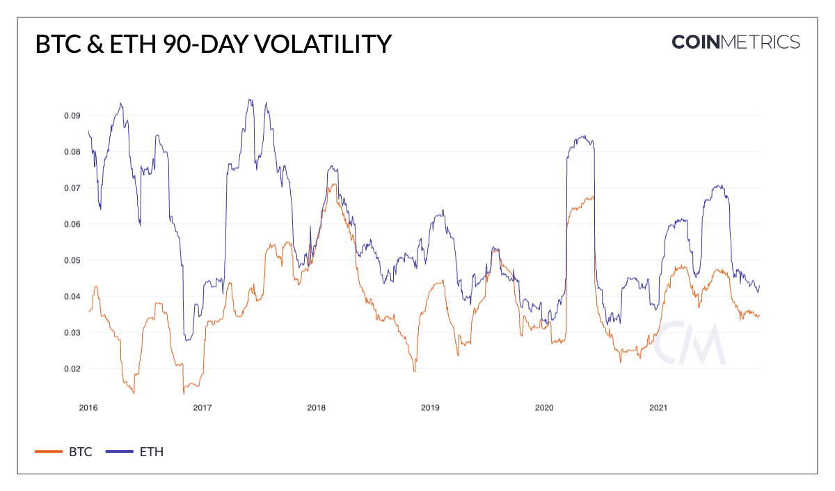 И хотя ситуация на крипторынке может показаться неспокойной, волатильность (измеренная по дневной логарифмической доходности за 90-дневный скользящий период) на сегодня остается сравнительно низкой и для BTC, и для ETH, и чрезвычайно далека от исторических максимумов, зафиксированных ранее в этом году.