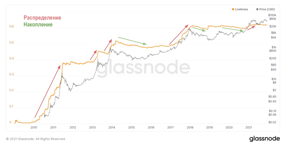 На протяжении всей истории биткойна можно видеть явные паттерны распределения и накопления монет долгосрочными держателями, лежащие в основе бычьих и медвежьих рыночных циклов и которые можно легко отслеживать с помощью коэффициента «живости».